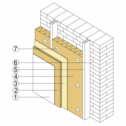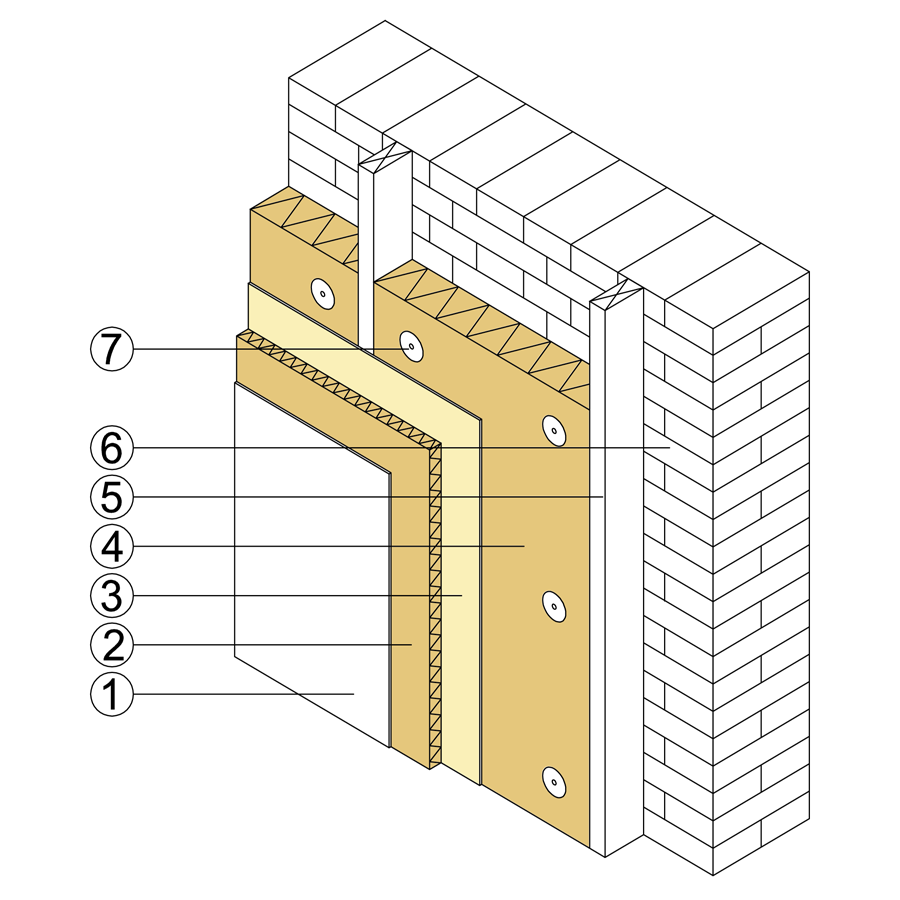 Izolacja ściany od wewnątrz metodą suchą polega na ułożeniu płyty VestaEco FLEX od wewnątrz pomieszczenia tak aby nie naruszać wyglądu zewnętrznego elewacji. Płyta o niskim oporze dyfuzyjnym posiada wysoką zdolność do pochłaniania pary wodnej dzięki czemu ogranicza zjawisko wykroplenia pary na wewnętrznej powierzchni ściany oraz zmniejsza ryzyko rozwoju pleśni. Mocowanie płyty do ściany murowanej przy pomocy kołków.